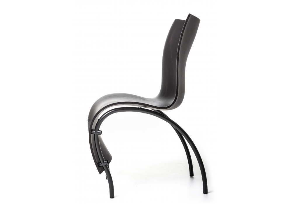 1Skin firmata da Ron Arad per Moroso è una sedia con scocca in faggio curvato multistrato 3D tinto e struttura in acciaio verniciato a polvere nero.