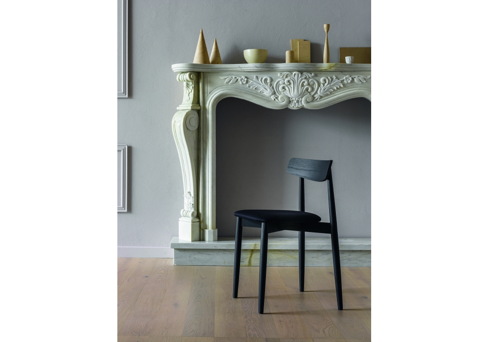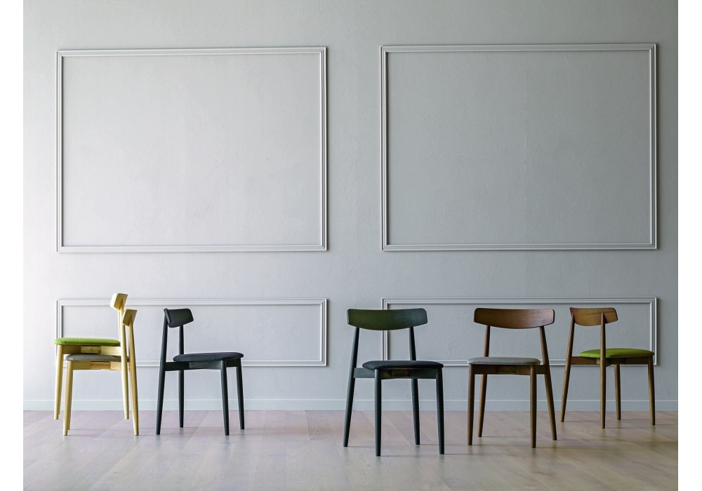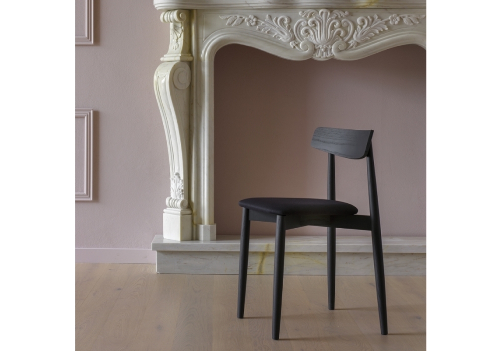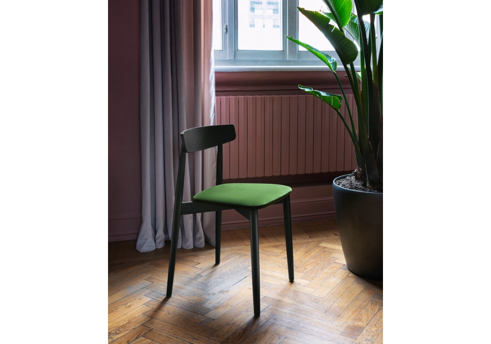 Claretta firmata da Florian Schmid per Miniforms è una sedia impilabile con struttura in legno di frassino laccato o anilina disponibile in diversi colori. Seduta in tessuto.