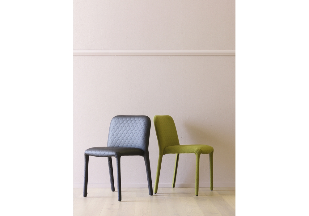 Pelè firmata da E-ggs per Miniforms è una sedia impilabile con struttura in metallo totalmente rivestita in tessuto o eco-pelle.