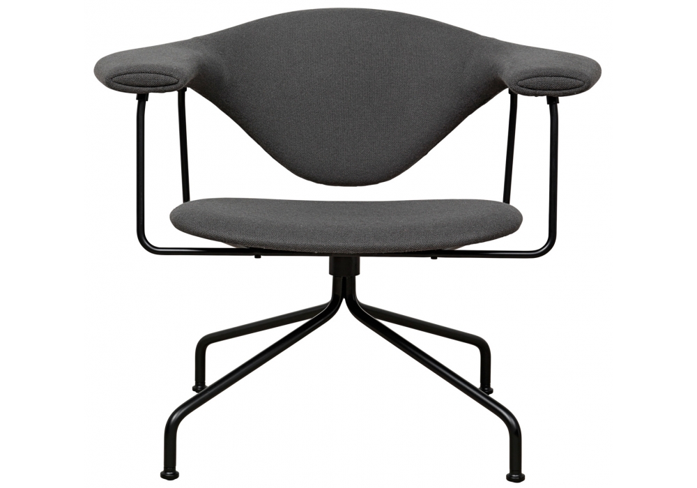 Masculo Lounge firmata da GamFratesi per Gubi è una sedia con base girevole realizzata con struttura in acciaio nero semi opaco e rivestimento in tessuto o in pelle.