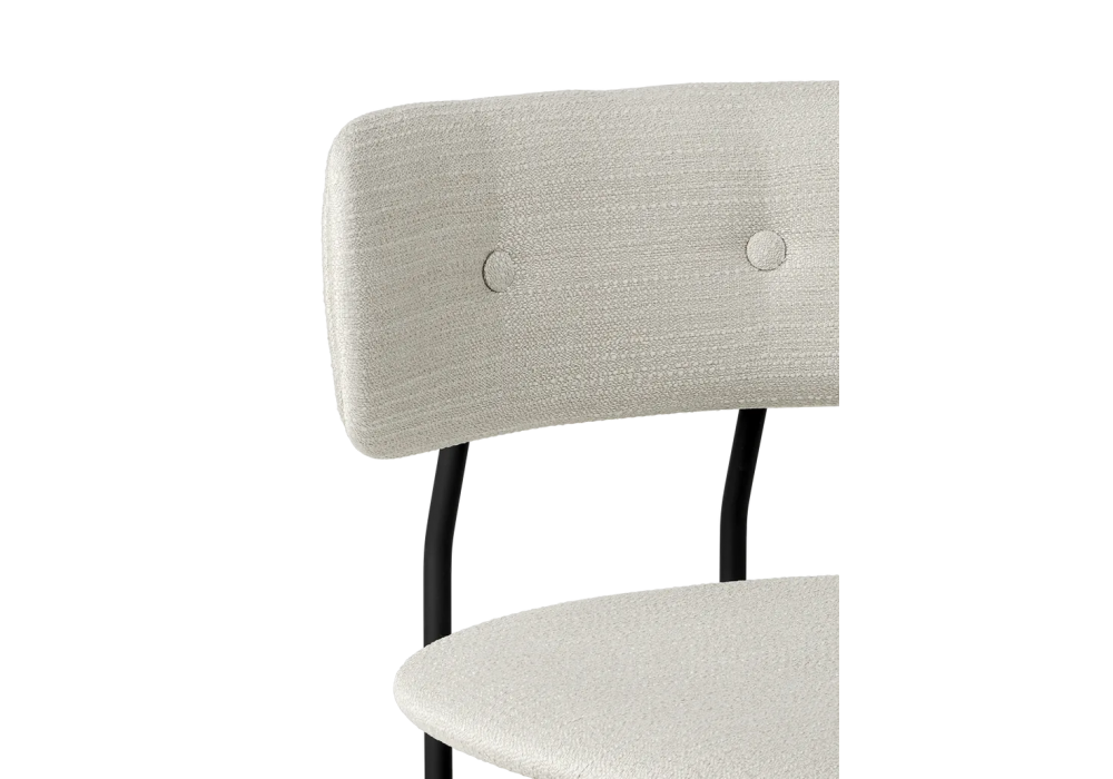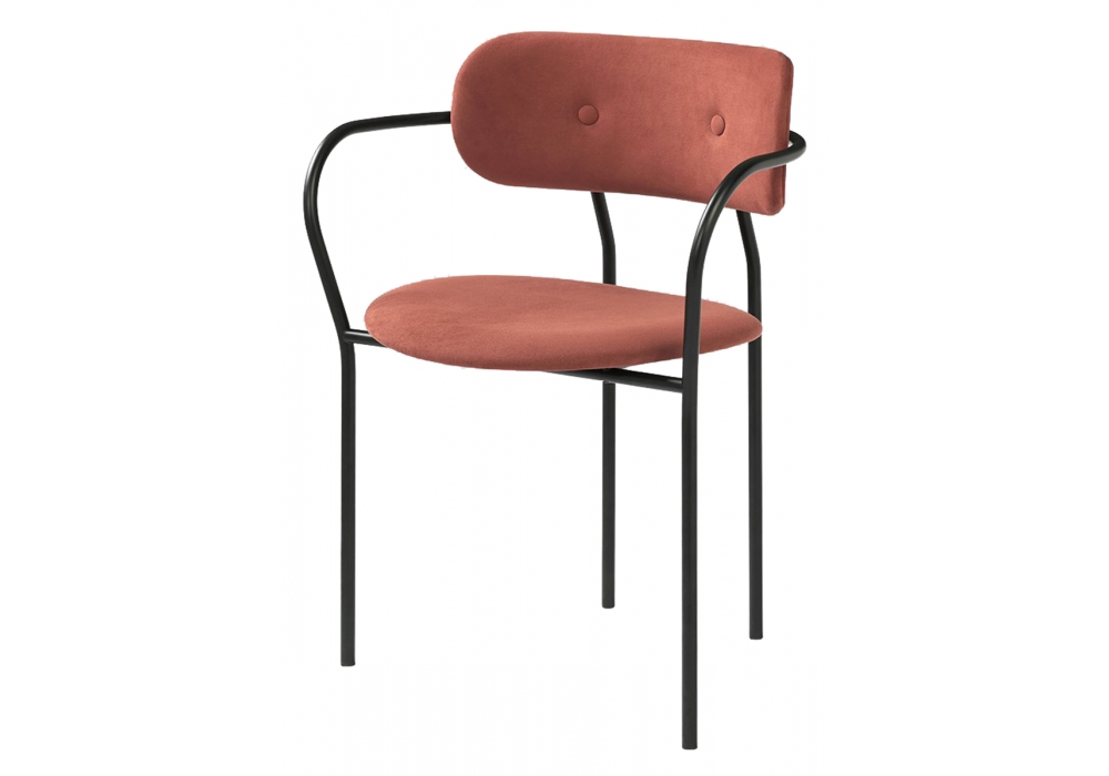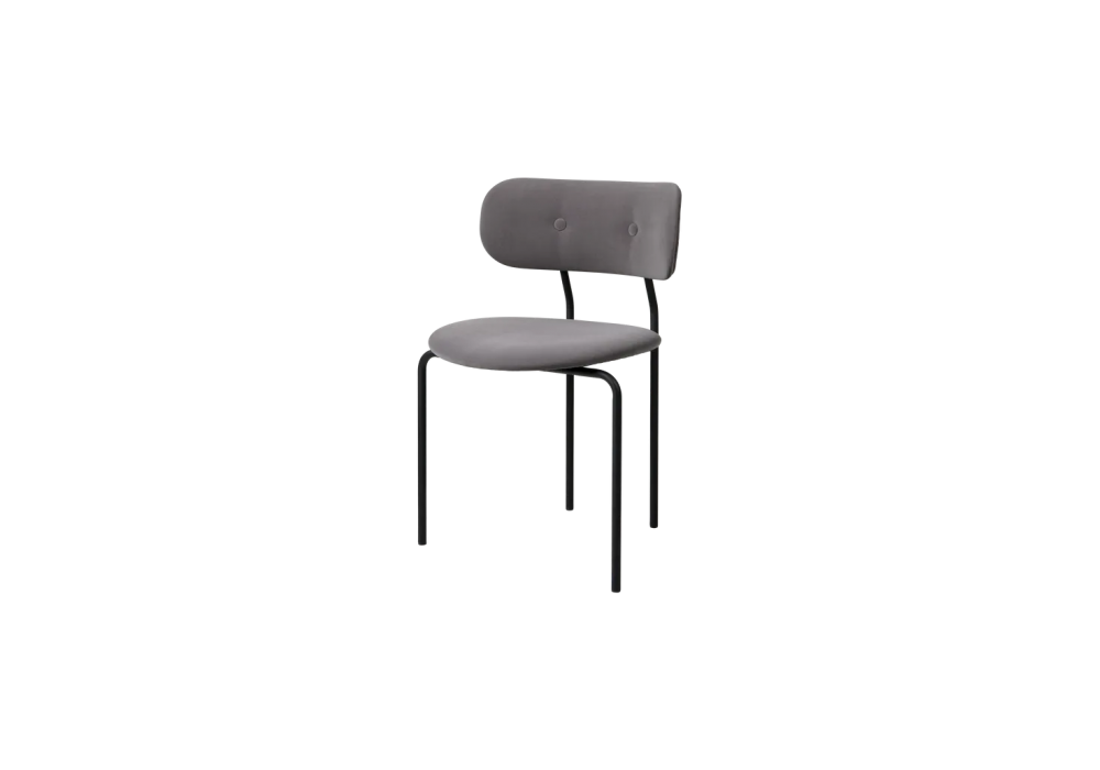 Coco firmata da OEO Studio per Gubi è una sedia con seduta e schienale in compensato modellato completamente rivestito in tessuto o pelle e base di colore nero. Disponibile in differenti finiture, con o senza braccioli.