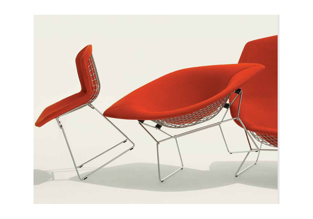 Bertoia firmata da Harry Bertoia per Knoll è una sedia completamente rivestita in tessuto o pelle. La struttura è realizzata in tondino d'acciaio saldato ad ogni intersezione. Disponibile in varie finiture.
