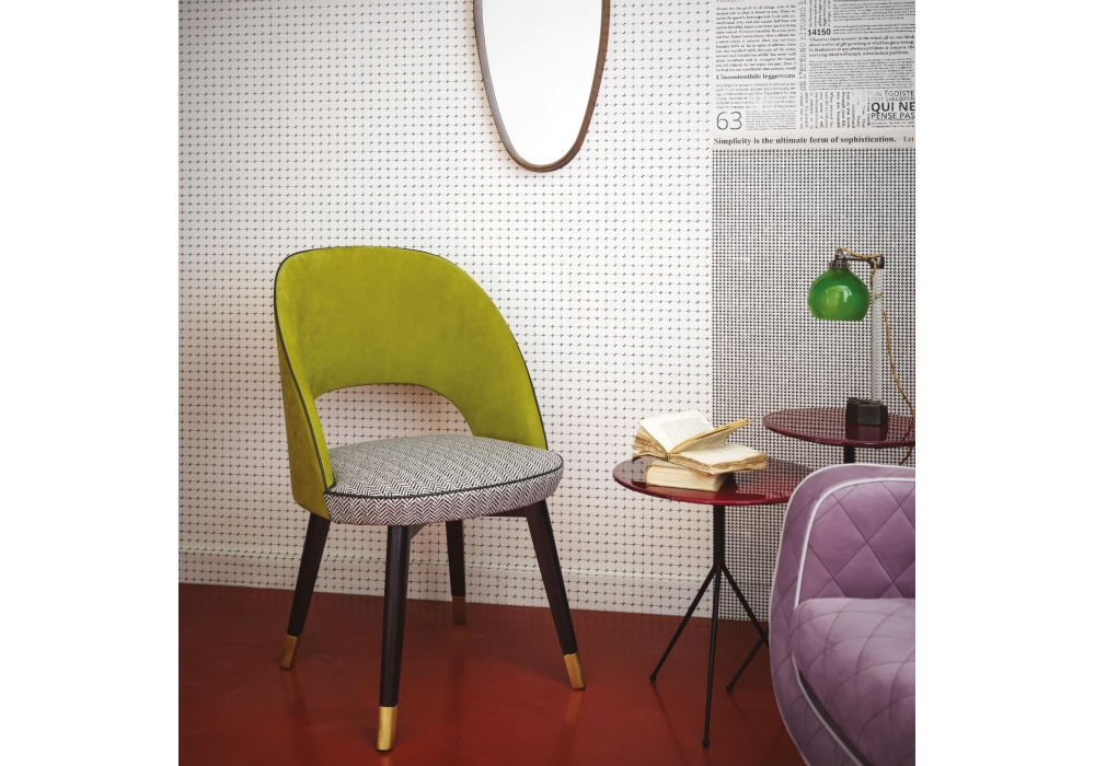 Colette firmata da Roberto Lazzeroni per Baxter è una sedia con struttura schienale in legno multistrato curvato di pioppo e betulla. Imbottitura in poliuretano espanso a densità differenziata con rivestimento in fibra acrilica. Molleggio a nastri elastici di caucciù rivestito. Basamento in frassino tinto wengé. Puntale del piedino in ottone satinato,in metallo brunito spazzolato a mano o in metallo nichelato satinato, con vernice opaca. Profilo decorativo nella medesima tonalità di cuoio.