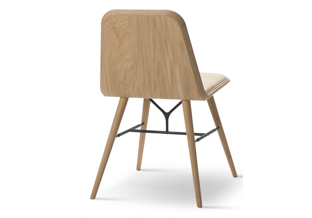 Spine firmata da Space Copenhagen per Fredericia è una sedia con struttura in legno massello di rovere o frassino con supporto metallico verniciato a polvere. Scocca del sedile in compensato con anima in faggio. Lato anteriore della scocca del sedile imbottito con schiuma e rivestito in tessuto o pelle, rifinito con bordino.