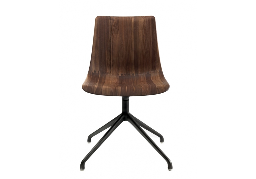 Materia firmata da Claudio Bellini per Riva 1920 è una sedia con scocca avvolgente realizzata in legno massello con schienale e seduta unite tra loro attraverso una scenografica giunzione a coda di rondine. Dotata di base girevole in ferro.