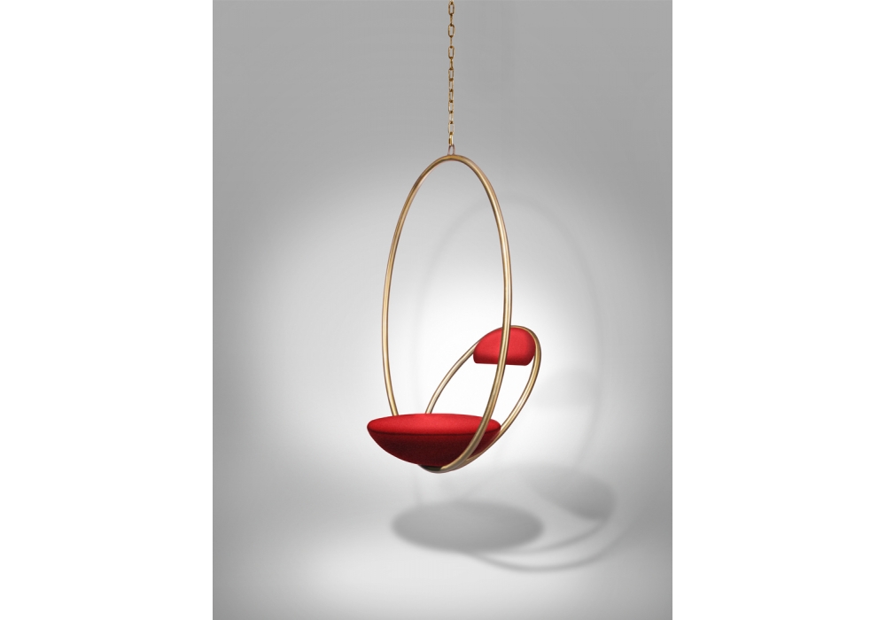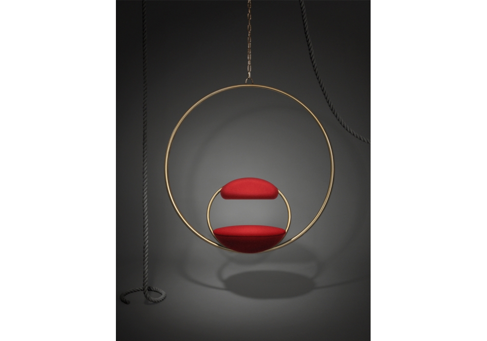 Hanging Hoop Chair firmata e prodotta da Lee Broom è una sedia sospesa realizzata da due cerchi concentrici in acciaio nero o ottone. Seduta e schienale sono rivestiti in tessuto rosso di casa Kvadrat.