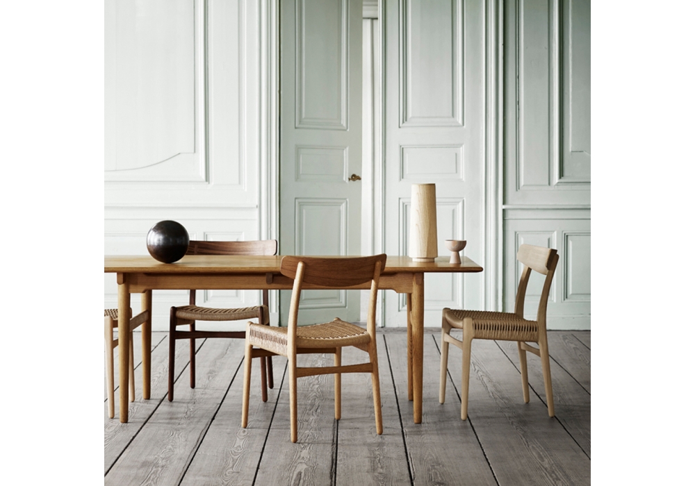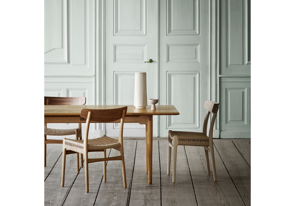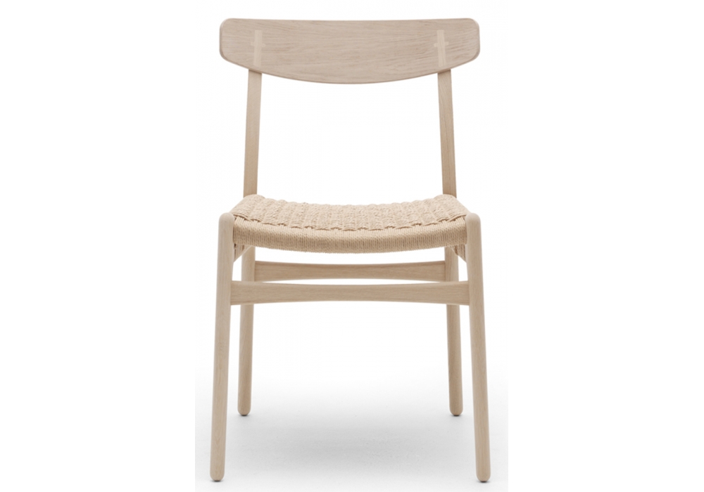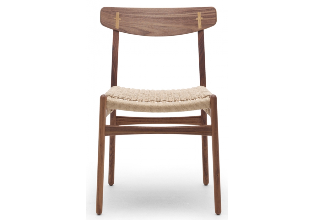 CH23 firmata da Hans J. Wegner per Carl Hansen & Søn è una sedia con struttura e schienale in rovere o noce in diverse finiture e seduta in paper cord naturale o nero. Rovere/Noce è una versione combinata, con struttura della seduta in rovere e schienale in noce. Lo schienale è decorato con intarsi nella stessa finitura della struttura. Nella versione rovere/noce l'intarsio è color rovere.