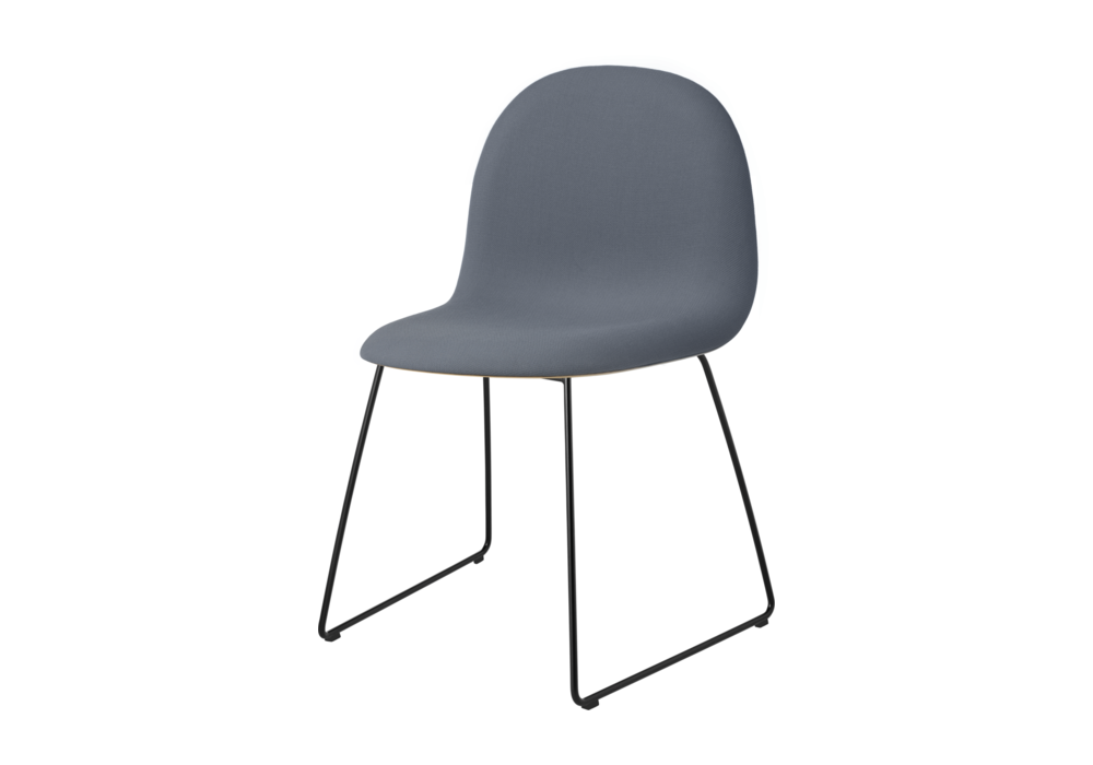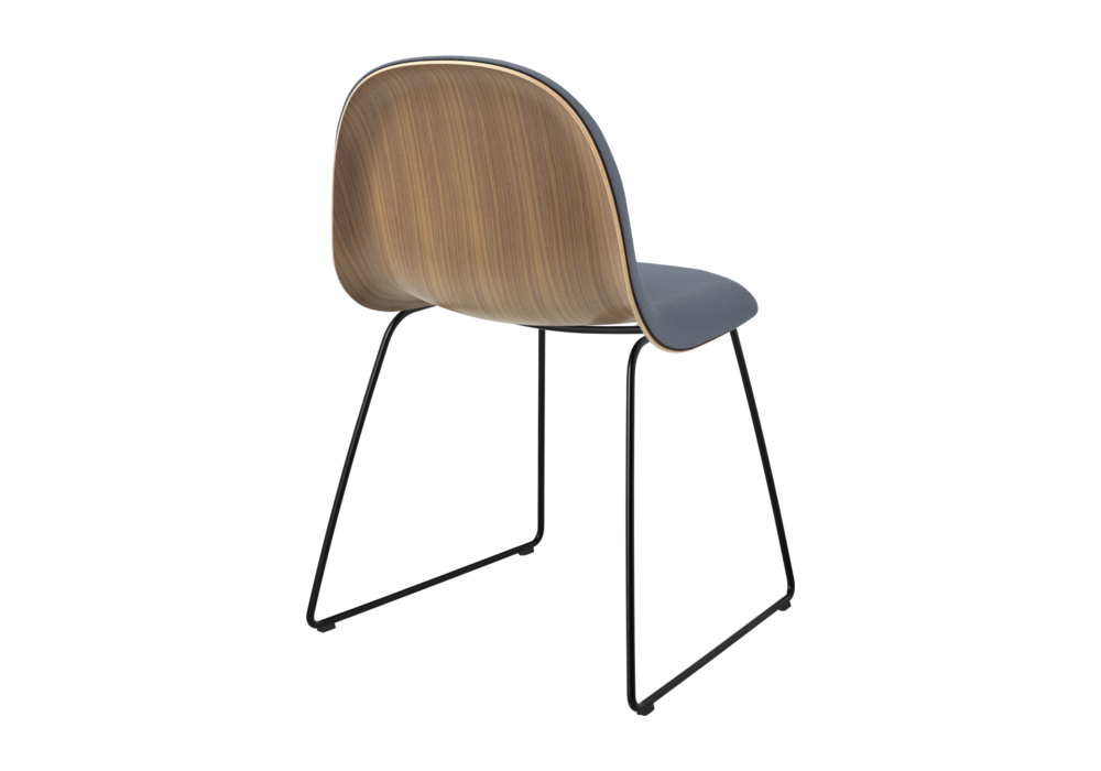 3D firmata da Komplot Design per Gubi è una sedia con base a slitta. Scocca in legno e base nera o cromata. Rivestimento in tessuto o pelle.