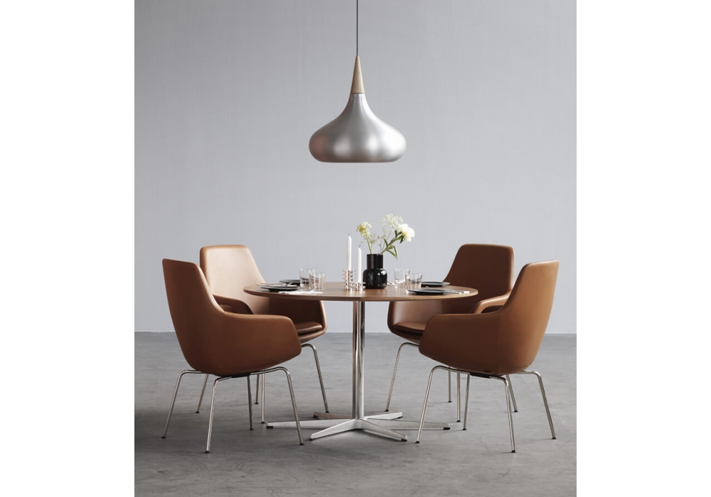 Little Giraffe™ firmata da Arne Jacobsen per Fritz Hansen è una sedia con gambe in metallo cromato o verniciato a polvere nero e rivestimento disponibile in tessuto o pelle.