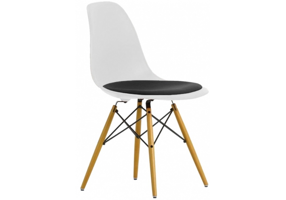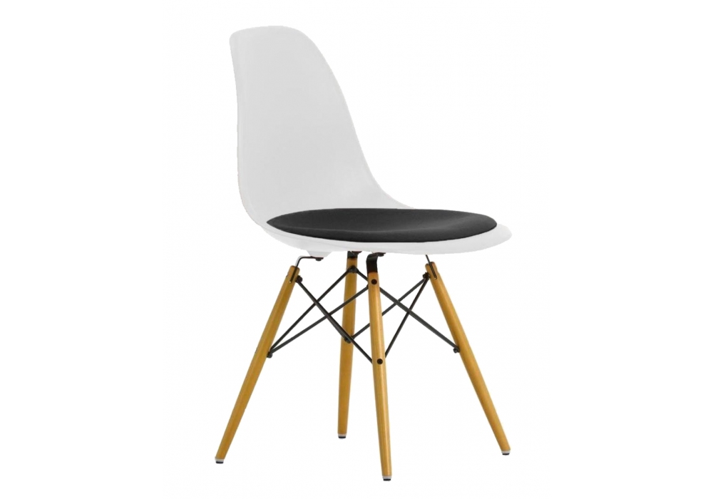 Eames Plastic Side Chair DSW disegnata da Charles e Ray Eames per Vitra è una sedia con cuscino della collezione DSW con scocca realizzata in polipropilene disponibile in diverse finiture e cuscino in tessuto. Basamento rinforzato in legno di acero o frassino e fili metallici.