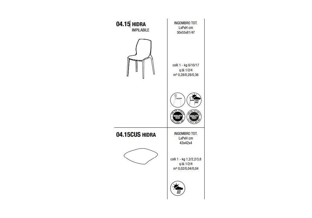 Hidra firmata da Pocci & Dondoli per Bontempi è una sedia impilabile con struttura integrale in polipropilene e fibra di vetro, in diverse finiture. E' possibile aggiungere un cuscino di seduta in poliuretano, in diversi colori.