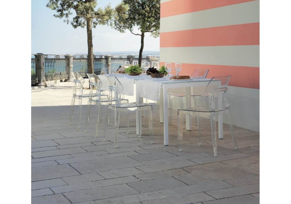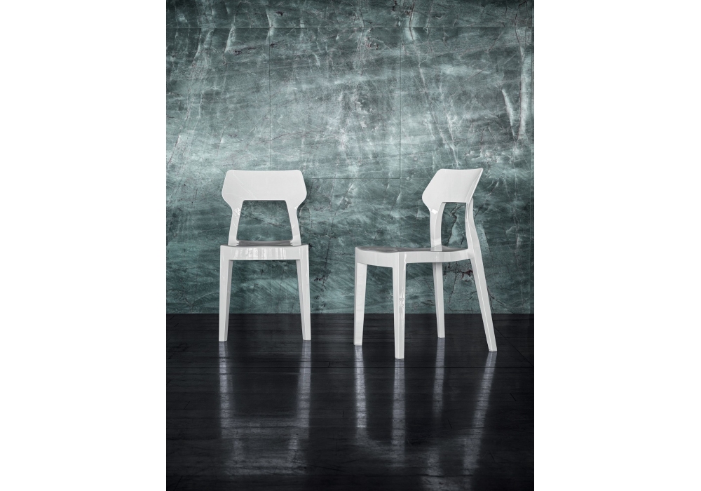 Aria firmata da Pocci & Dondoli per Bontempi è una sedia adatta per uso interno o esterno realizzata in policarbonato.