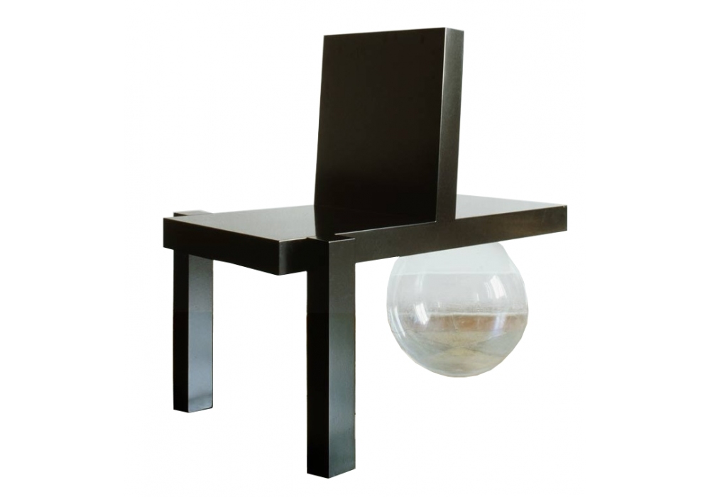 Harry firmata da Bill Woodrow per Memphis Milano è una sedia realizzata in legno laccato nero con sfera di Plexiglass.