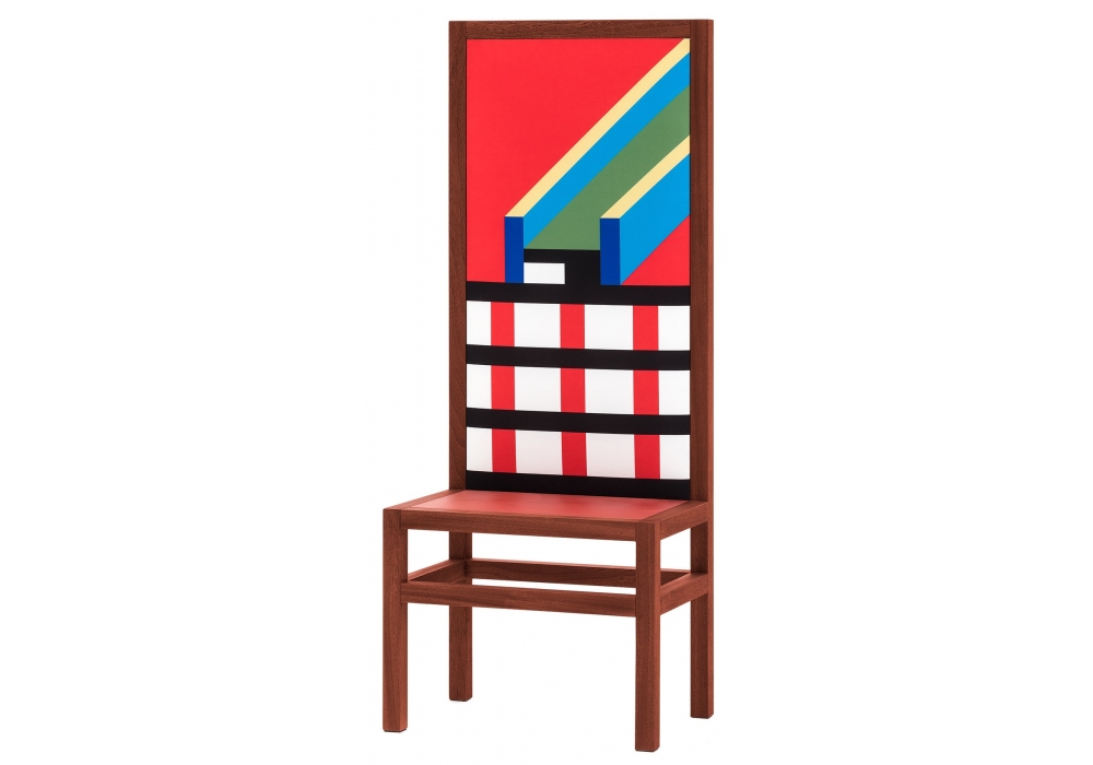 Marmo firmata da Nathalie Du Pasquier per Memphis Milano è una sedia in mogano, seduta in legno impiallacciato, schienale in tessuto stampato.
