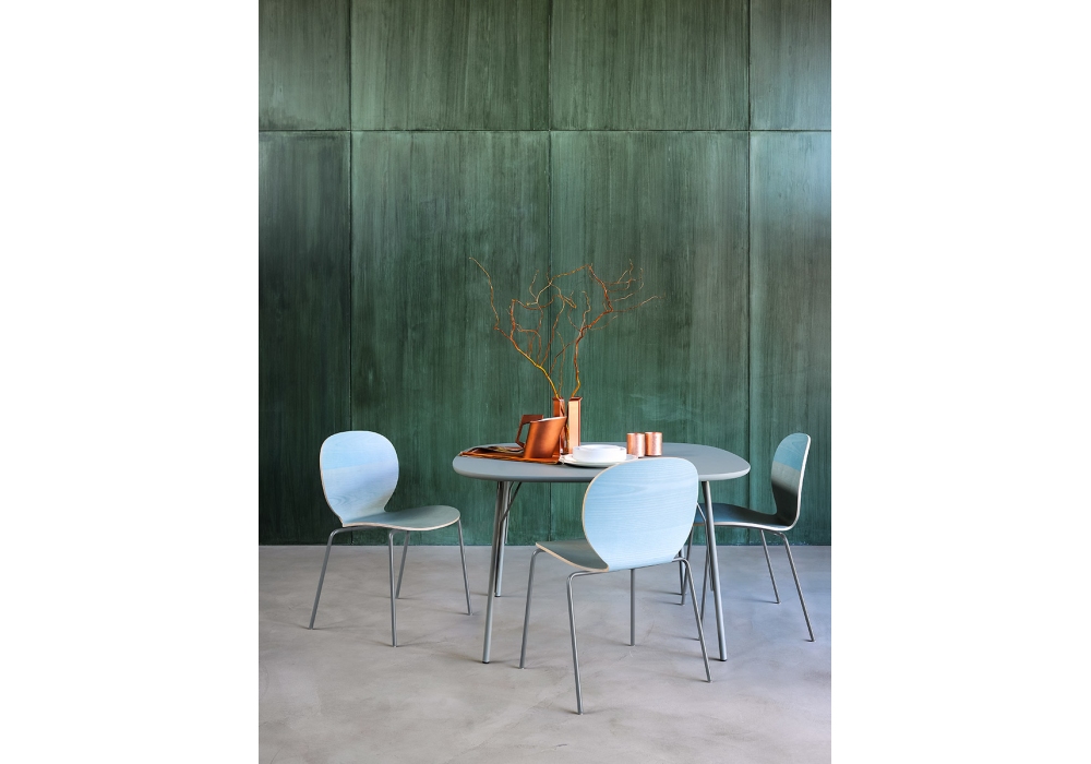 Kelly V firmata da Claesson Koivisto Rune per Tacchini è una sedia con scocca in frassino tinto monocolore o bicolore. La base è in metallo tubolare, verniciata a polveri o cromata.