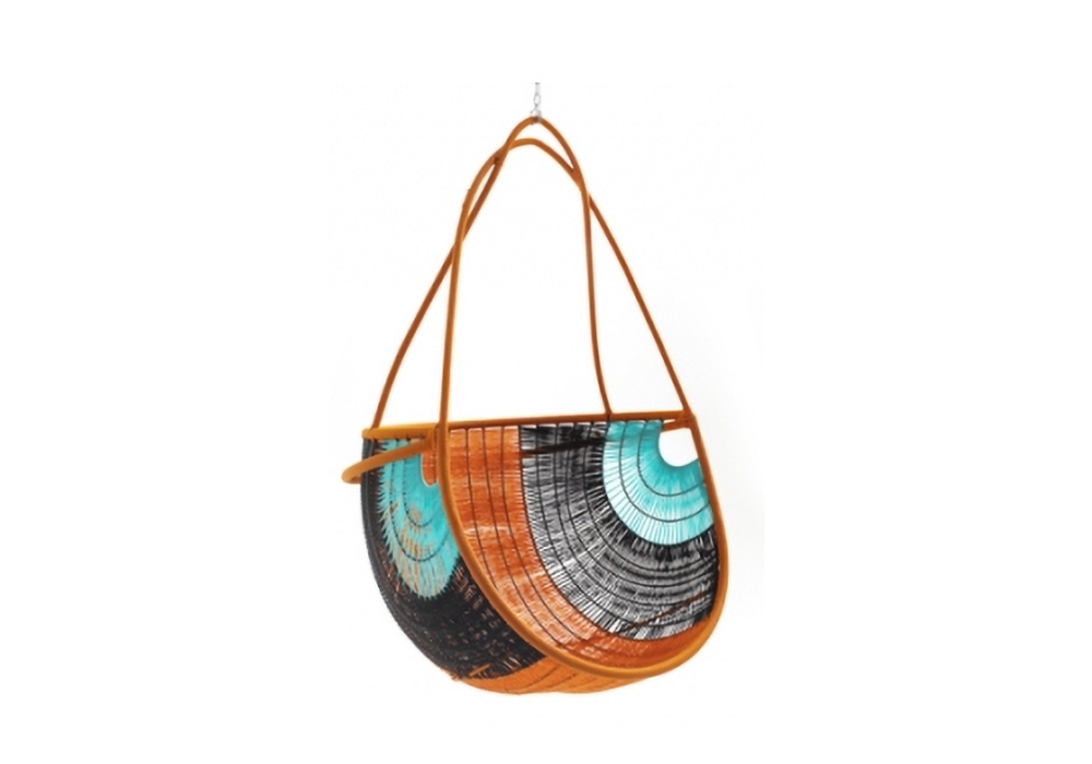 Arco firmata da Martino Gamper per Moroso è una sedia sospesa realizzata con base in acciaio verniciato e fili colorati in polietilene intrecciati a mano.