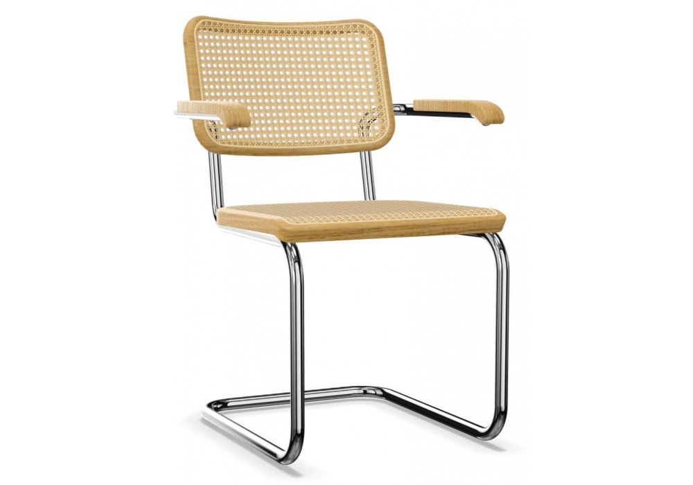 S 64 V firmata da Marcel Breuer, Artistic copyright Mart Stam per Thonet è una sedia a slitta con telaio in tubolare d'acciaio cromato. Seduta e schienale in canna d'India intrecciata. Bordatura della seduta, dello schienale e appoggiabraccia disponibili in diverse finiture.