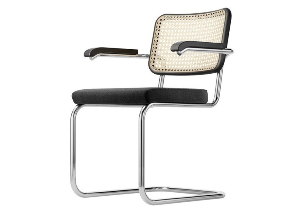 S 64 SPV firmato da Marcel Breuer, Artistic copyright Mart Stam per Thonet è una sedia a slitta con telaio in tubolare d'acciaio cromato. Seduta imbottita con rivestimento in tessuto pelle o cuoio. Schienale in canna d'India intrecciata. Appoggiabraccia in faggio mordenzato, noce o rovere in diverse finiture. Il cordoncino o le cuciture sono inoltre disponibili in differenti versioni.