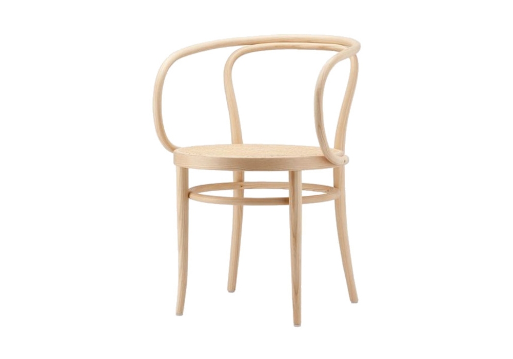 209 firmata da Gebrüder Thonet per Thonet è una sedia con braccioli in legno curvato e piedini in plastica. Seduta in canna d'India. Struttura in faggio, disponibile in diverse finiture.