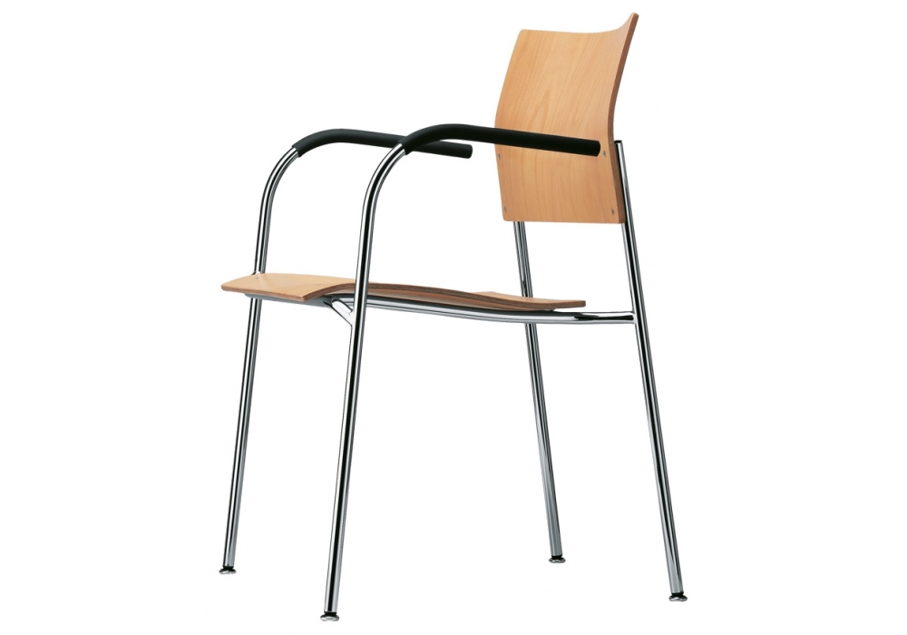 S 361 F firmata da Delphin Design per Thonet è una sedia con struttura in tubolare d'acciaio cromato e piedini in plastica. Seduta e schienale in compensato di faggio sagomato, disponibile in diverse finiture. Appoggiabraccia in elastomero.