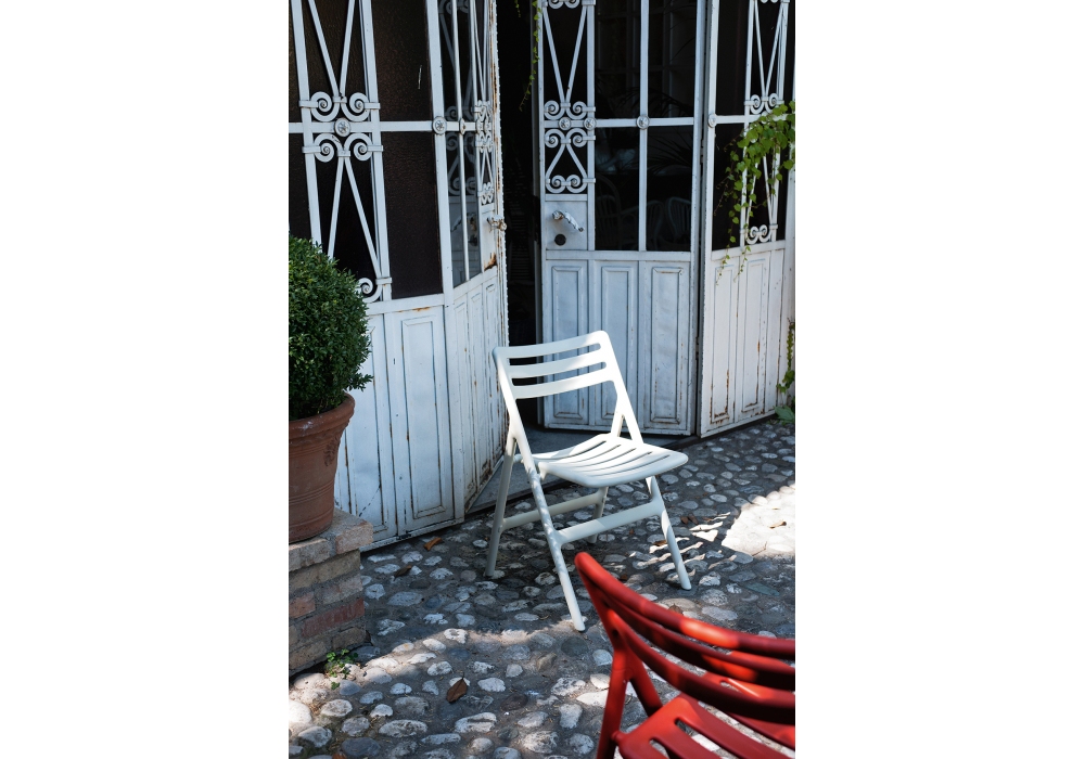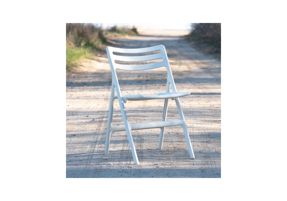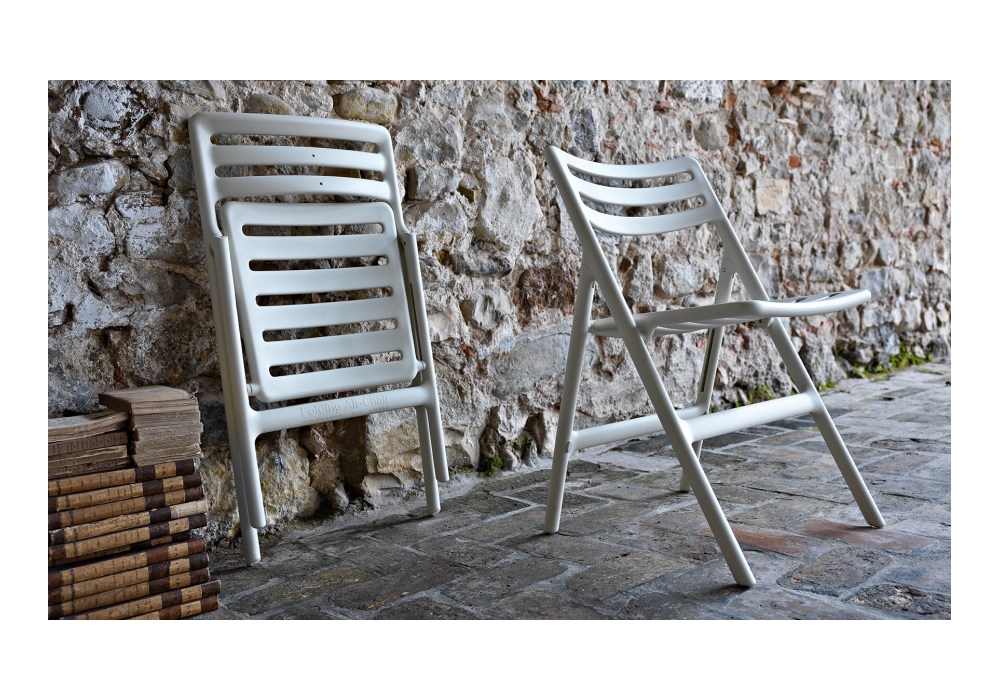 Folding Air-Chair firmata da Jasper Morrison per Magis è una sedia realizzata in polipropilene caricato di fibra di vetro. Adatta anche per esterni.