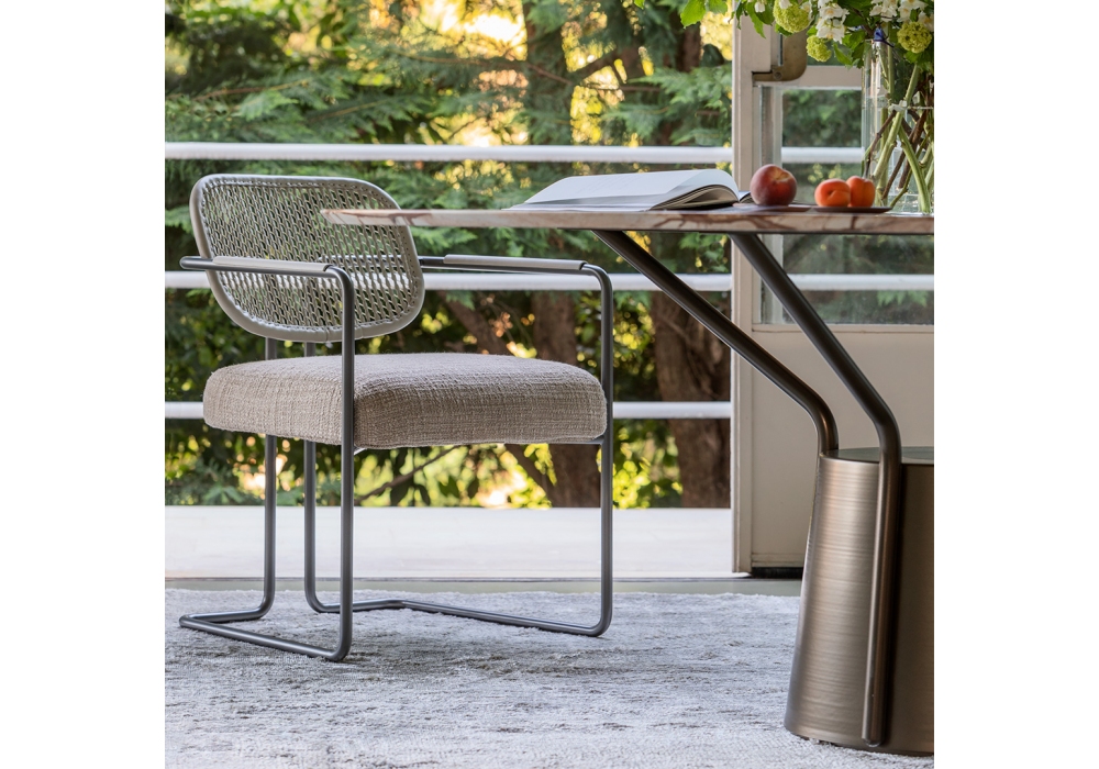 Arno firmata da Matteo Nunziati per Natevo è una poltroncina con struttura in metallo brunito opaco, schienale rivestito in pelle intrecciata, sedile imbottito con rivestimento in tessuto o pelle. Dettagli dei braccioli in pelle in tinta con lo schienale.