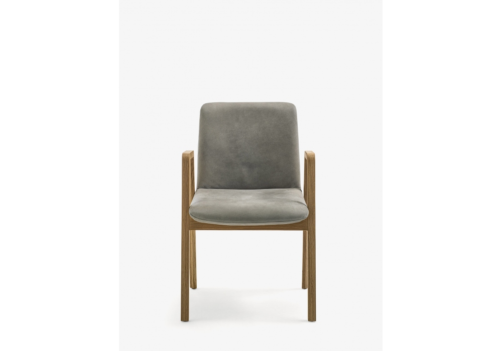 Noblé Chair firmata da Gabriele & Giuliano Cappelletti per Riva 1920 è una sedia caratterizzata da scocca in poliuretano, dotata di schienale e comoda seduta schiumati e rivestiti in pelle o tessuto con cuciture a vista. I braccioli in legno massello, disponibili in due versioni (H. 53 cm oppure H. 64 cm), formano una linea di continuità con le gambe.