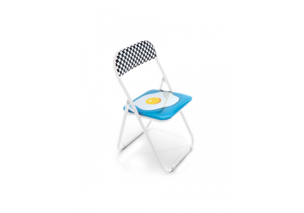 Egg firmata da Studio Job per Seletti è una sedia pieghevole con struttura in metallo e seduta e schienale imbottiti e rivestiti in PVC.