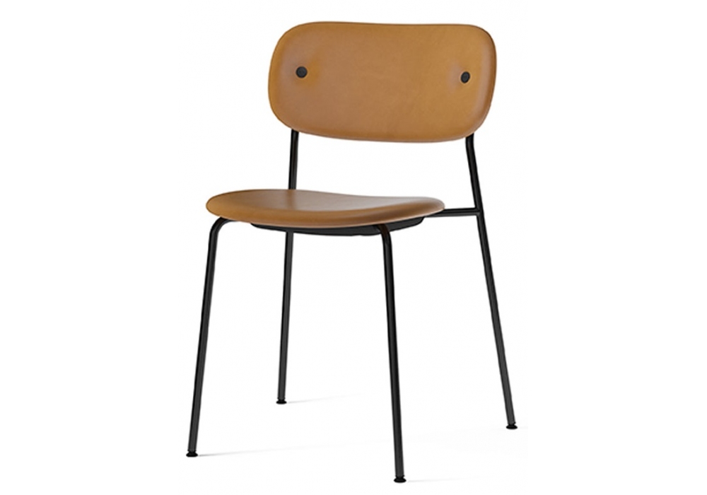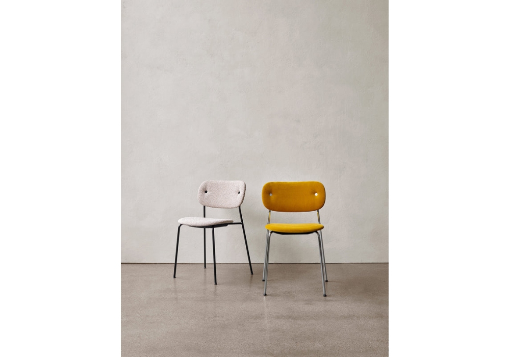 Co Fully firmata da Norm Architects & Els Van Hoorebeeck per Audo Copenhagen è una sedia con seduta e schienale imbottiti, rivestiti in tessuto o pelle. Gambe in tubolare d'acciaio verniciato a polvere nero o cromato.