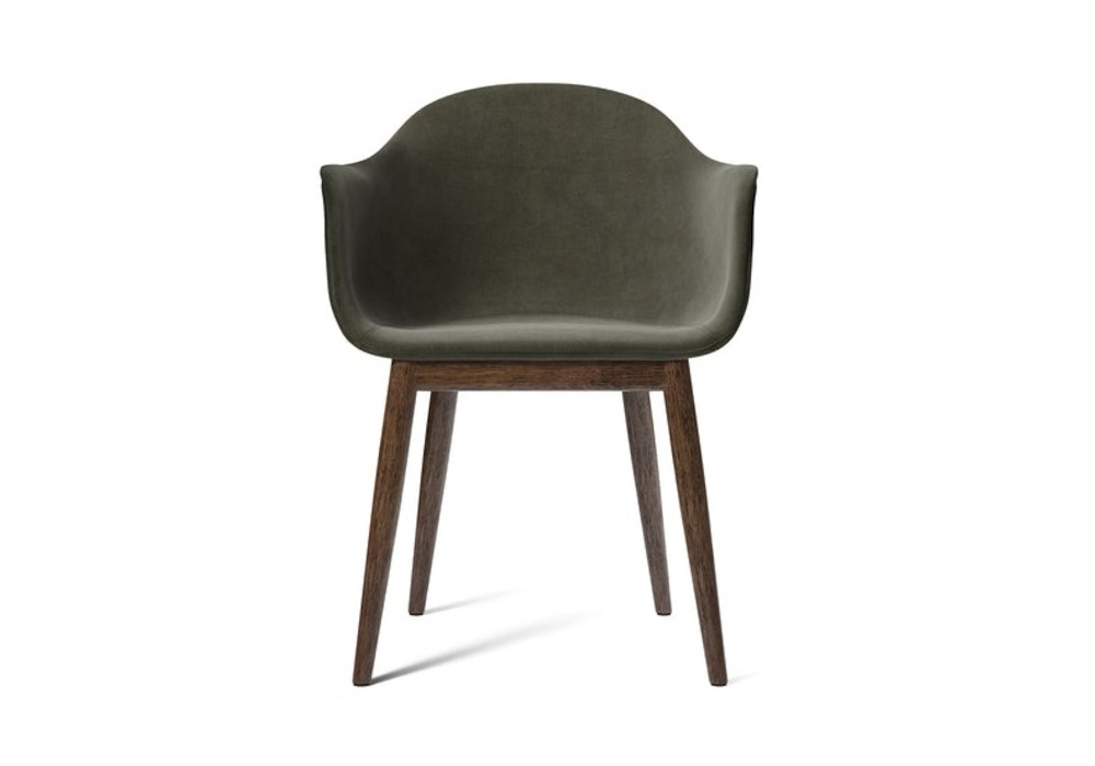 Harbour Oak firmata da Norm Architects per Audo Copenhagen è una sedia con scocca imbottita rivestita in tessuto o pelle, gambe in rovere. Disponibile in diverse finiture.
