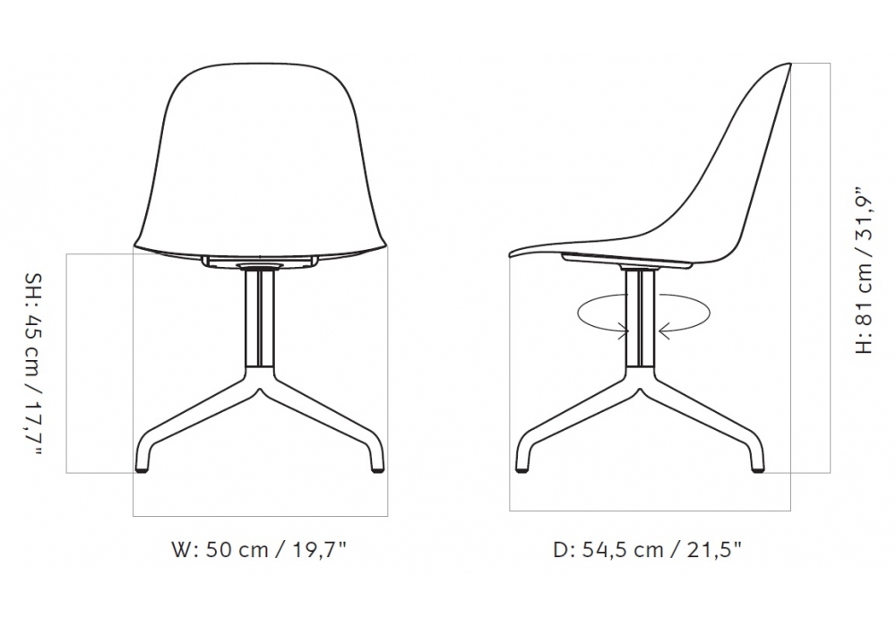 Harbour Side Plastic firmata da Norm Architects per Audo Copenhagen è una sedia girevole con scocca in polipropilene con fibra di vetro, base in alluminio. Disponibile in diverse finiture.
