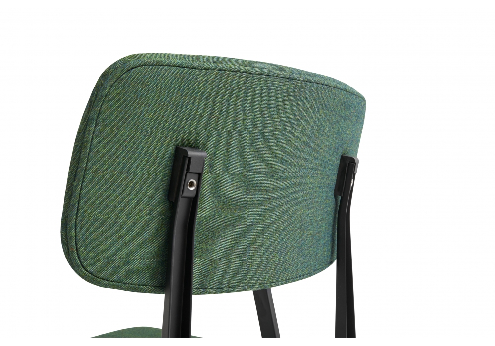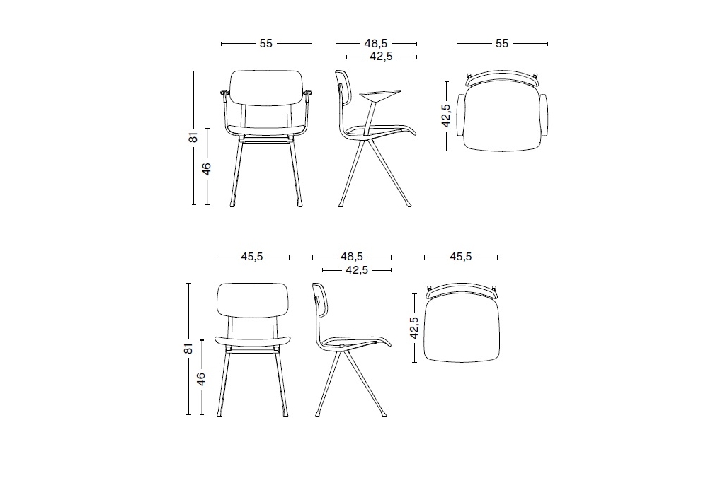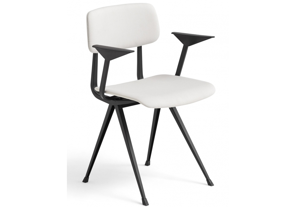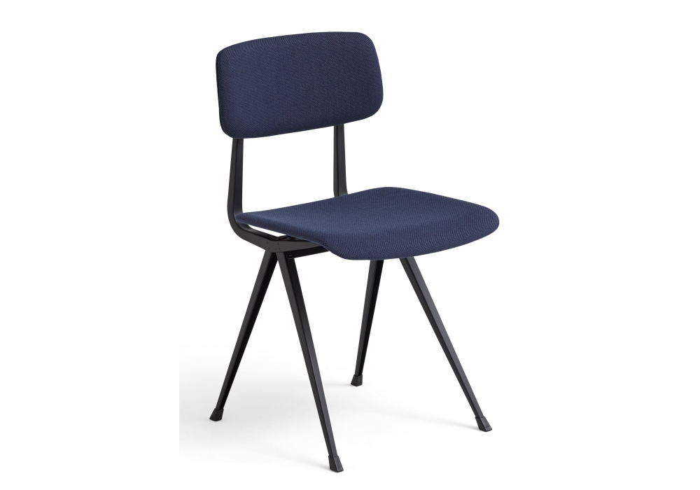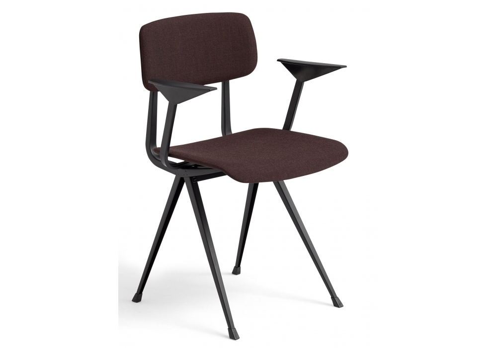 Result firmata da Friso Kramer & Wim Rietveld per Hay è una sedia rivestita con sedile e schienale in multistrato impiallacciato in rovere con rivestimento in pelle o tessuto e base in lamiera d'acciaio curvata verniciata a polvere nera. É possibile scegliere la versione con braccioli in ABS o senza. Disponibile in differenti rivestimenti e versioni.