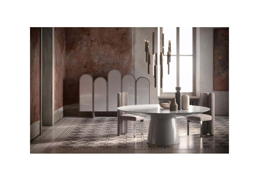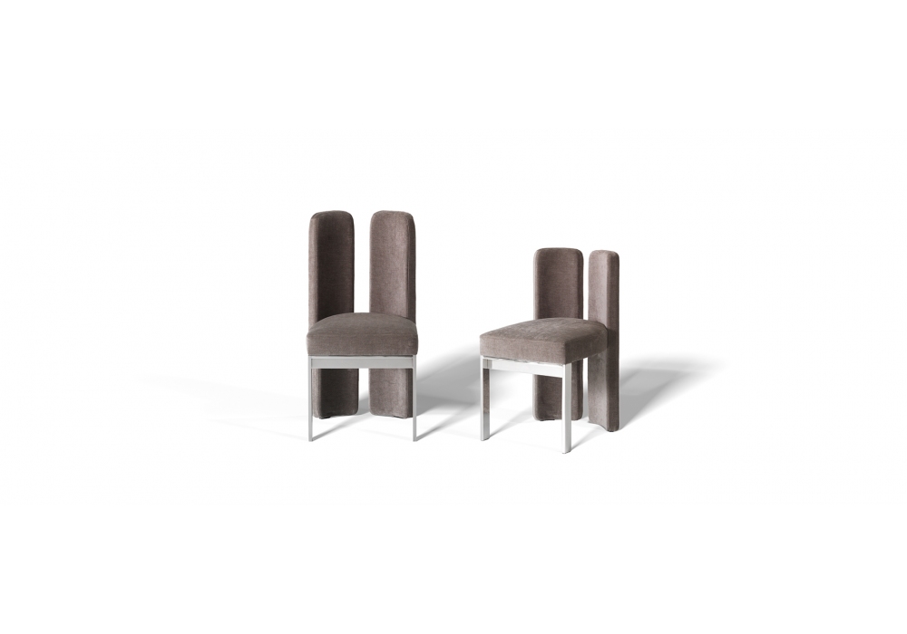 Nina firmata da Elena Pancaldi per Emmemobili è una sedia con struttura realizzata in legno multistrato curvato con imbottitura in gommapiuma rivestita in tessuto, velluto o pelle in differenti finiture. Il basamento è in ottone. Disponibile con schienale in due diverse altezze.