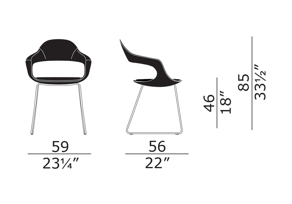Frenchkiss Slitta firmata da Stefano Bigi per Enrico Pellizzoni è una sedia con base a slitta in tondino d'acciaio, scocca con struttura in metallo, poliuretano espanso e rivestimento in diversi materiali e colori. Cuscino sottile integrato. Disponibile in due modelli, con schienale alto o con schienale basso.
