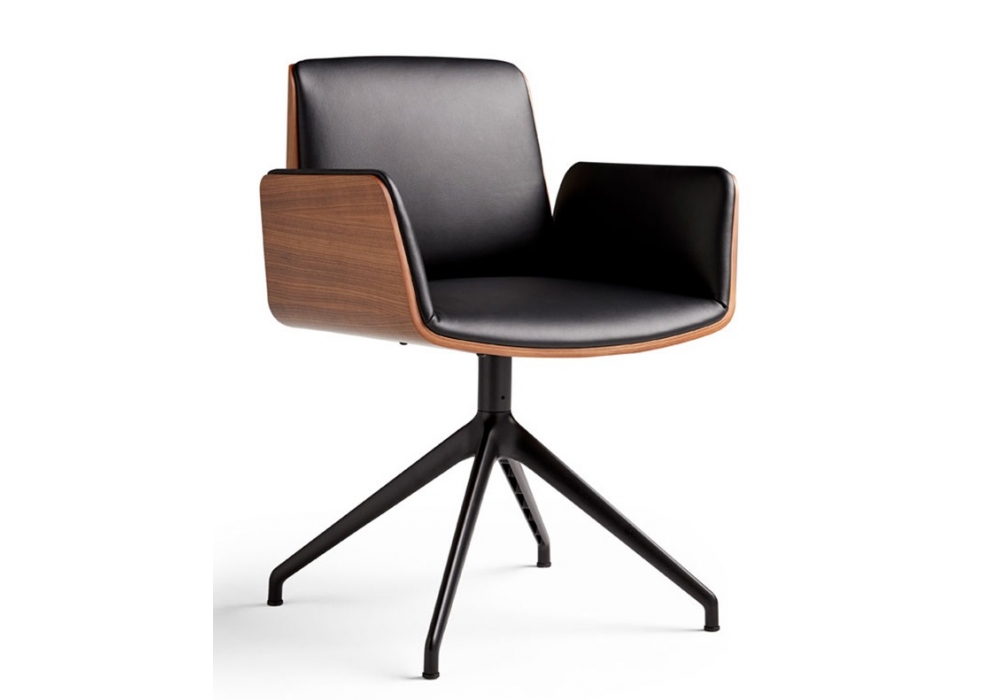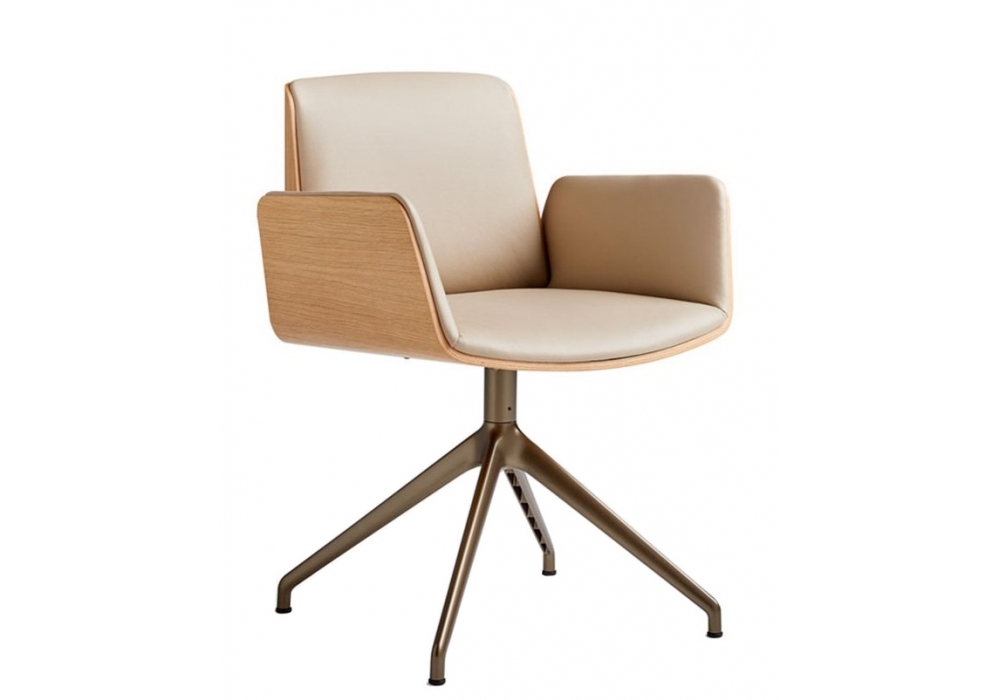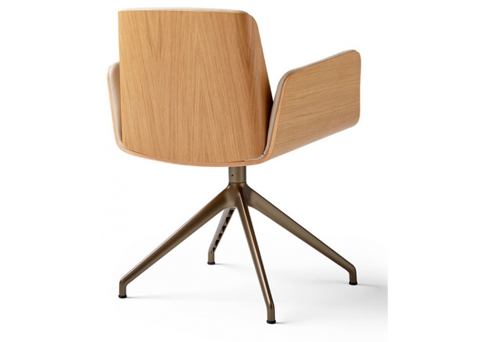 Hug Metal firmata da Manel Molina per Punt è una sedia con struttura in legno impiallacciato di rovere o noce con rivestimento interno in tessuto o pelle e base metallica con finitura bronzo o nera. Disponibile nella versione con o senza ruote.