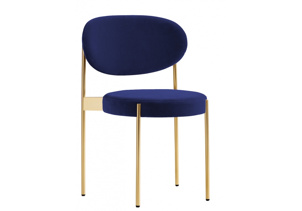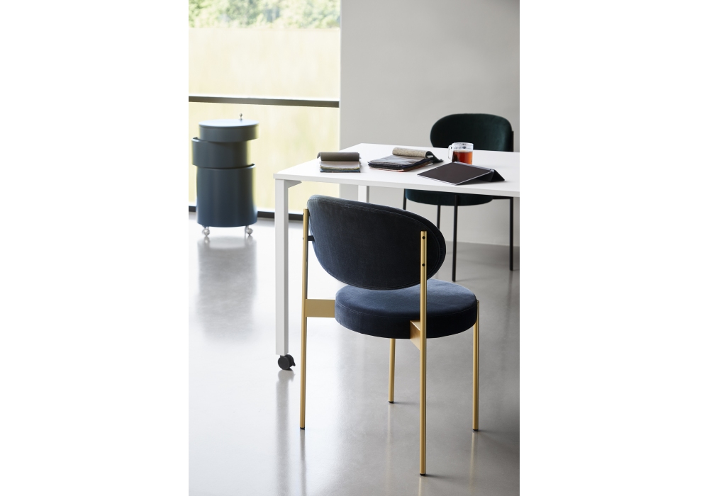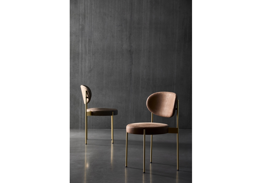 Series 430 firmata da Verner Panton per Verpan è una sedia impilabile completamente imbottita e rivestita in differenti tessuti o pelli. Struttura in metallo in finitura ottone con piedini in feltro.