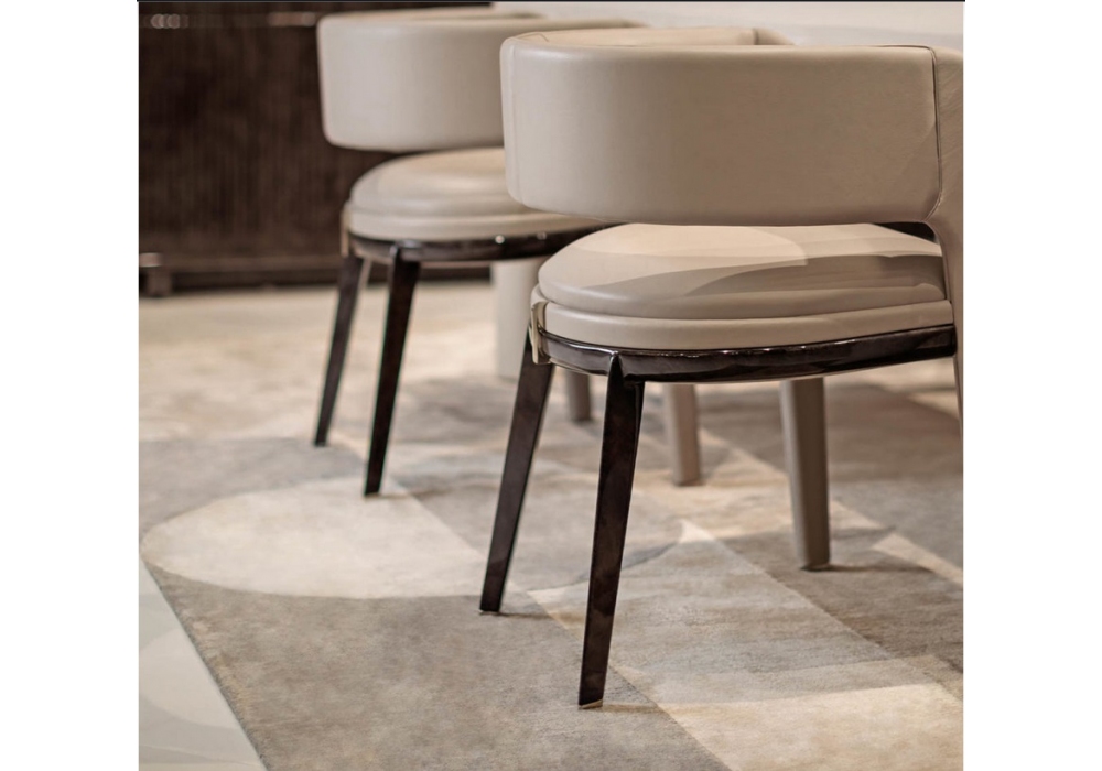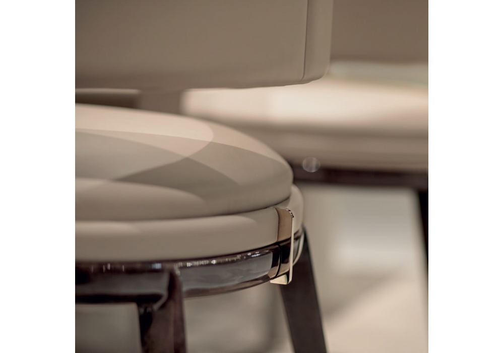 Eclipse firmata da Andrea Bonini per Turri è una sedia con struttura in legno massello e multistrato con finitura decorata a mano poliestere lucido. Rivestimento non sfoderabile in tessuto o pelle e dettagli in metallo in finitura oro chiaro.