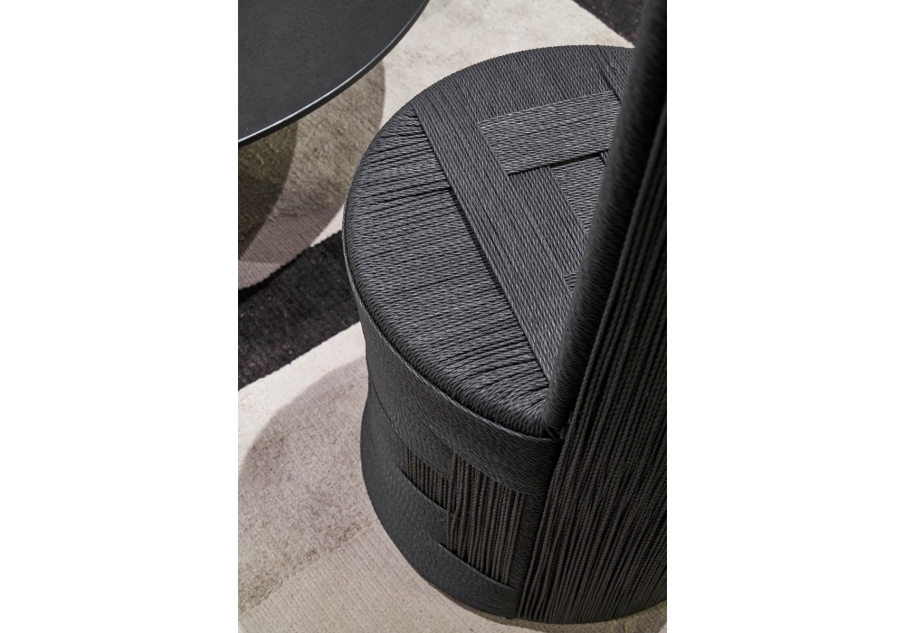 Miss Rope firmata da Studiopepe per Baxter è una sedia con struttura in metallo verniciato a polvere nero opaco. Intreccio in paper cord colore cognac o fumée.