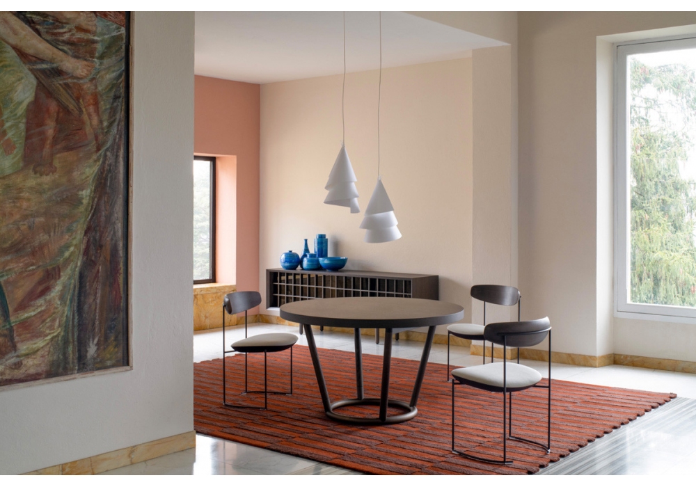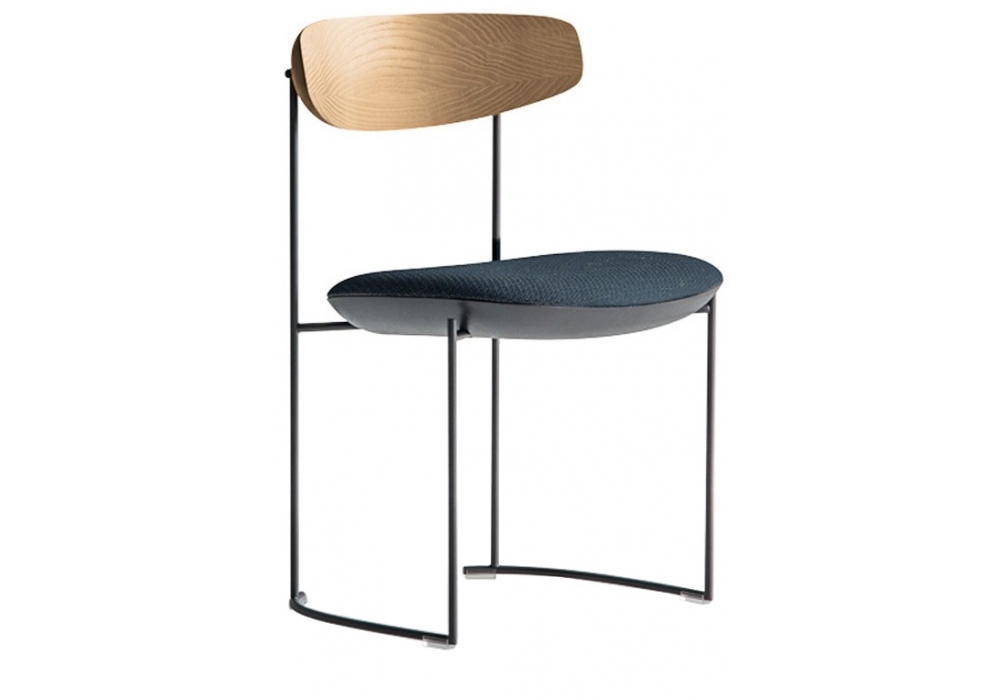 Keel Light firmata da M + V per Potocco è una sedia con struttura in tondino di metallo verniciato goffrato, schienale in massello di frassino e seduta in multistrato di betulla cinghiato in poliuretano espanso ignifugo rivestito in diversi tessuti, pelli o ecopelli.