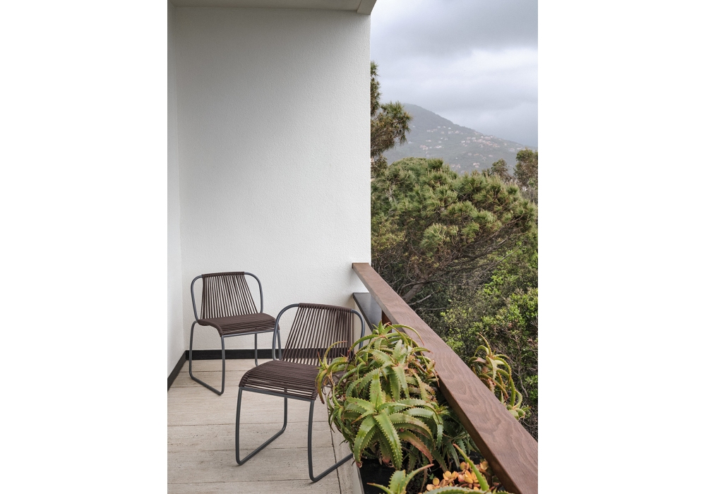 Tibes firmata da Gregorio Facco per Potocco è una sedia da esterno con struttura in acciaio verniciato a polveri epossidiche su cui si sviluppa la seduta, intrecciata interamente a mano. É possibile impilare fino a 4 sedie.