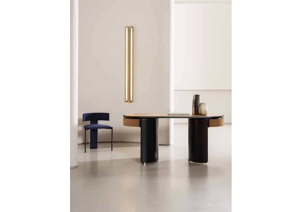 Zefir firmata da Studiopepe per Baxter è una sedia con struttura schienale in metallo a forma di “T” verniciata nero opaco. Imbottitura in poliuretano espanso a densità differenziata con rivestimento in fibra acrilica.