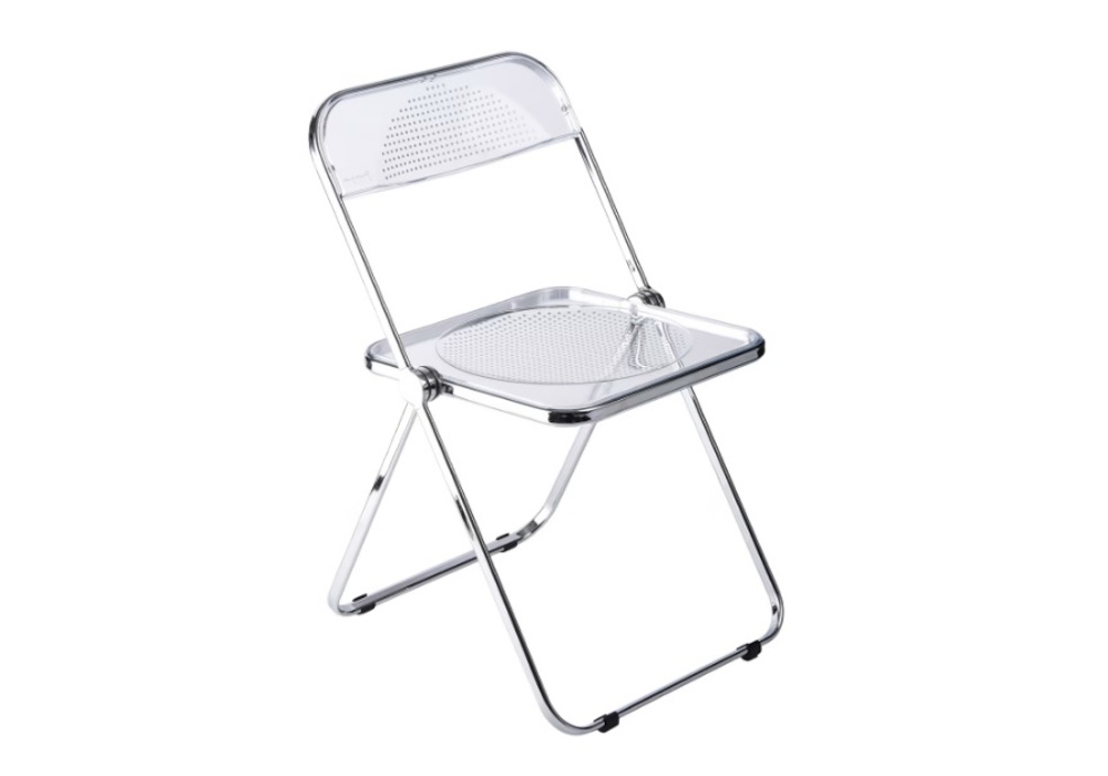 Plia 1969/2019 firmata da Giancarlo Piretti per Codiceicona è una sedia pieghevole in edizione limitata, realizzata in acciaio trasparente serigrafata.