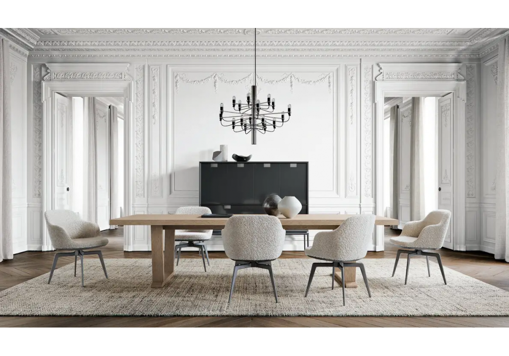 Caratos firmata da Antonio Citterio per Maxalto è una sedia girevole con struttura in alluminio verniciato e rivestimento in differenti tessuti o pelli.