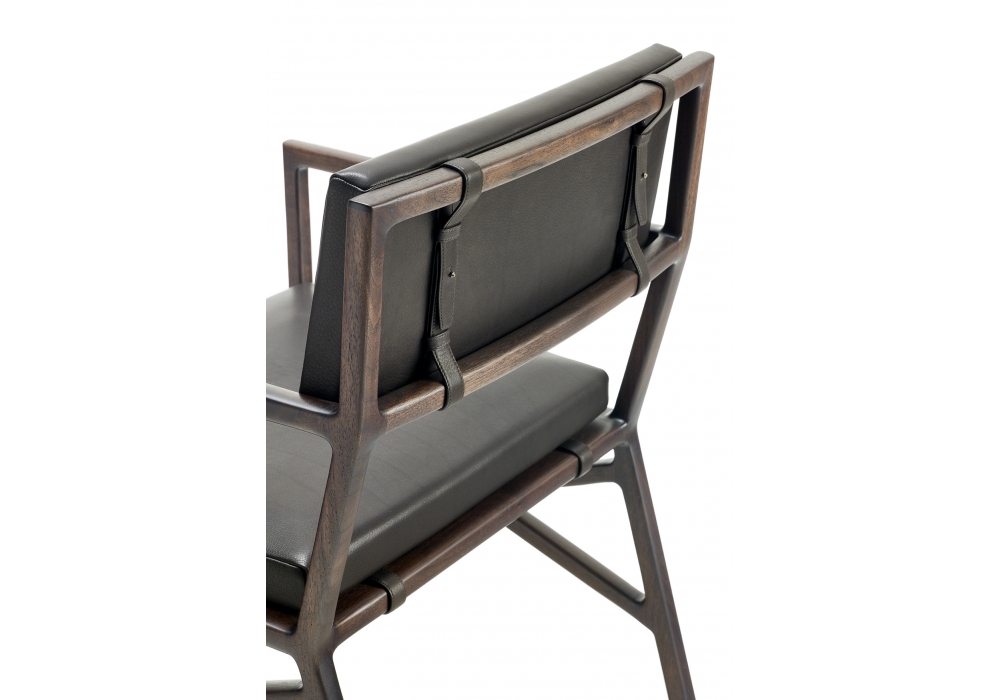Teahouse firmata da Christophe Pillet per Ceccotti Collezioni è una sedia con struttura in massello di noce americano. La seduta è realizzata in multistrato di pioppo impiallacciato con cuscinatura in pelle superiore fissata alla struttura tramite cinghie con borchiatura in ottone brunito.