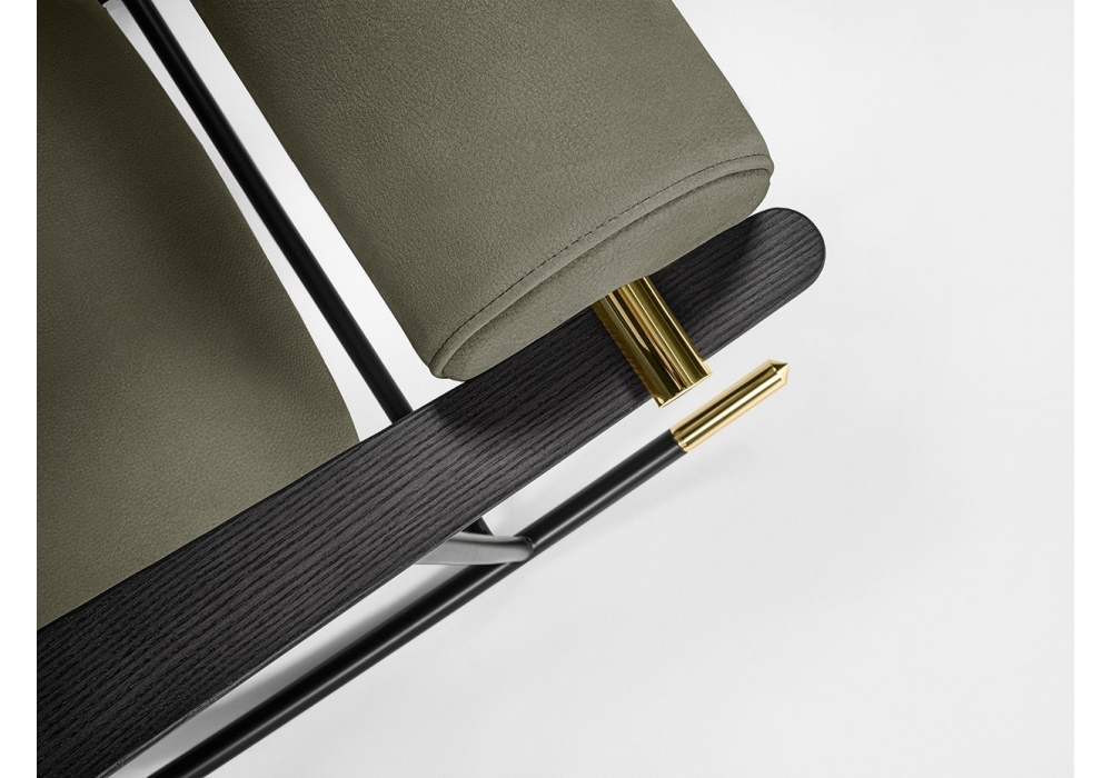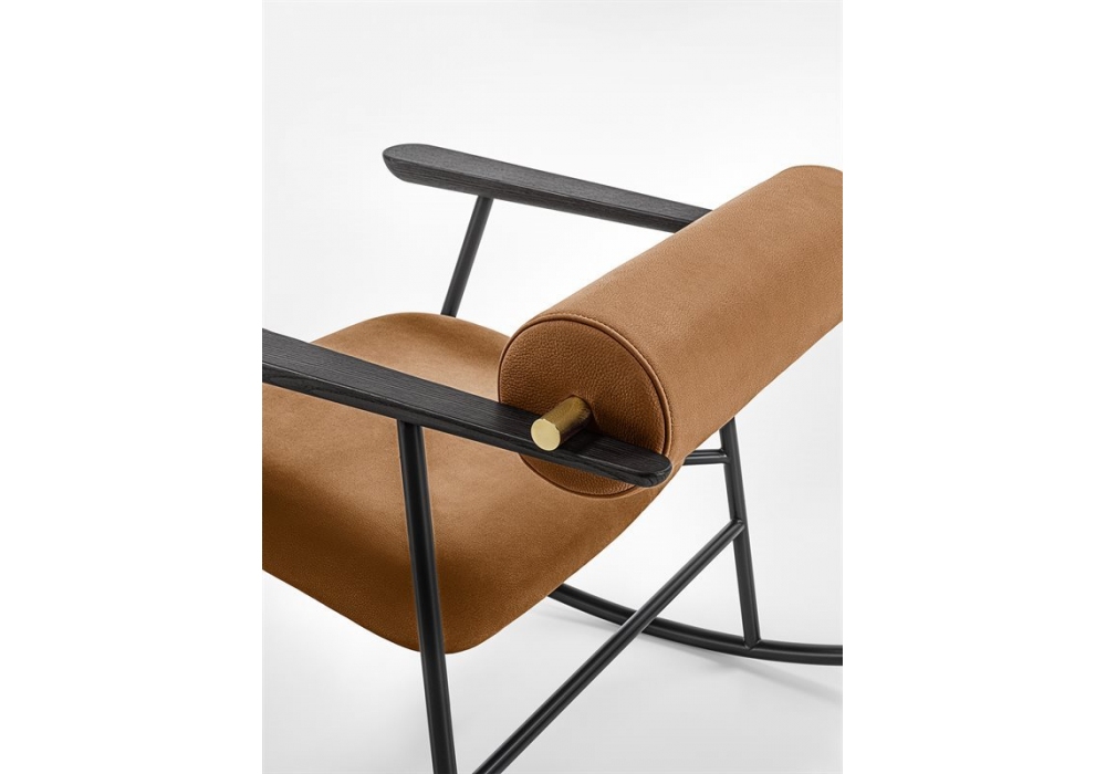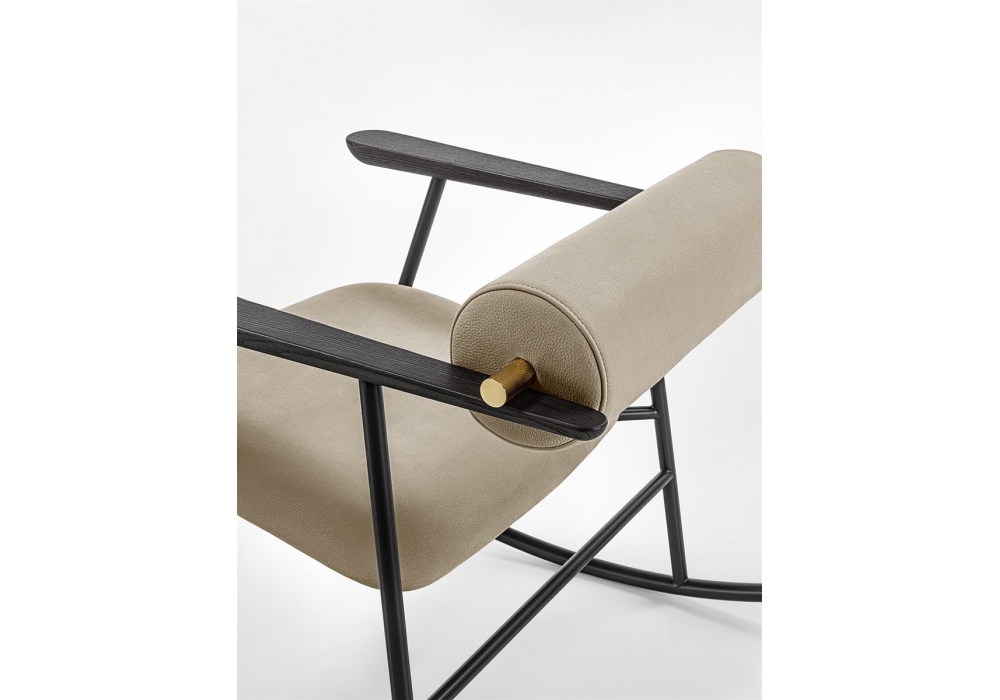 Loulou Rock firmata da David / Nicolas per Gallotti&Radice è una sedia a dondolo con struttura in metallo verniciato nero opaco e dettagli in acciaio nichelato lucido. Disponibili anche dettagli in acciaio ottonato lucido. Braccioli in legno massello di noce tinto nero a poro aperto oppure tinto miele a poro aperto. Seduta con struttura interna in legno e derivati. Seduta e schienale con imbottitura in poliuretano espanso indeformabile a densità differenziate. Rivestimento in tessuto o pelle nei colori del campionario. Non sfoderabile.