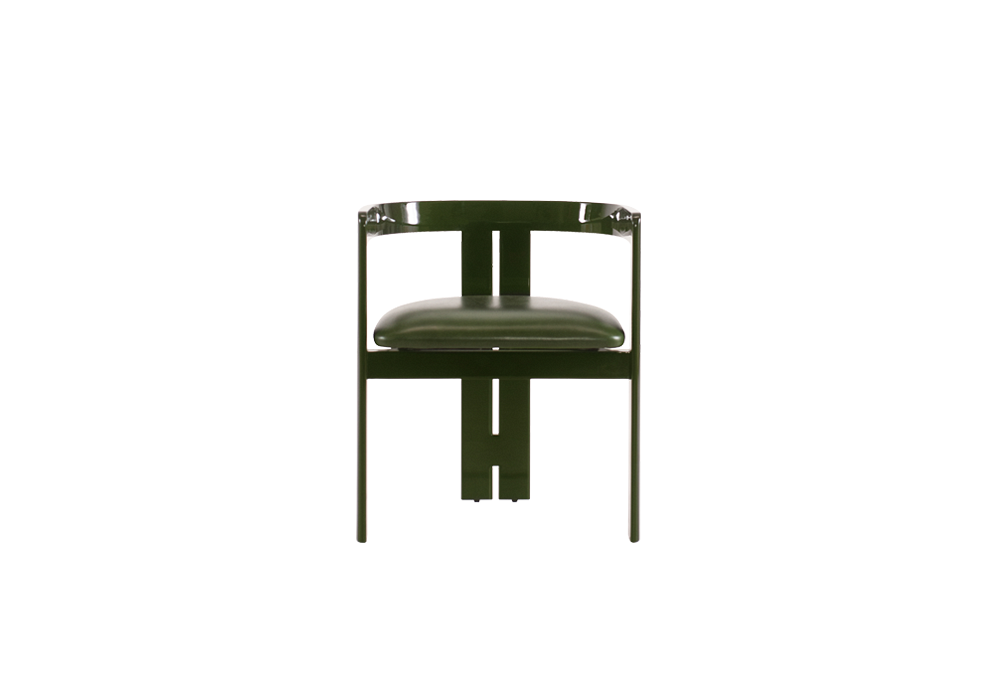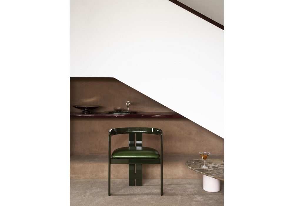 Pigreco firmata da Tobia Scarpa è una sedia composta da quattro gambe, due delle quali molto vicine, in legno laccato lucido. Il cuscino di seduta imbottito è disponibile in tessuto o pelle.