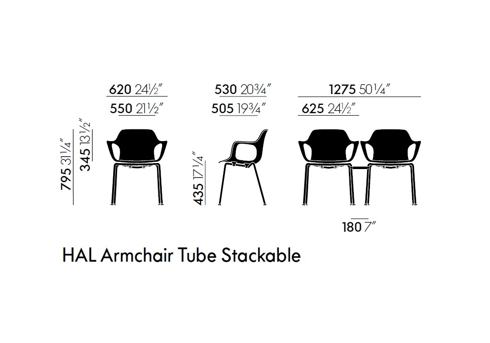 HAL RE Armchair Tube Stackable firmata da Jasper Morrison per Vitra è una sedia realizzata con scocca in polipropilene riciclato tinto in massa e basamento in tubolare di acciaio a quattro gambe, impilabile, finitura cromata o verniciata a polvere in basic dark.