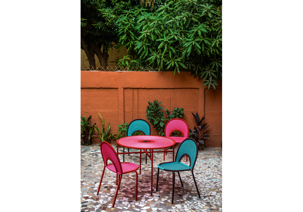 Banjooli firmata da Sebastian Herkner per Moroso è una sedia con struttura in acciaio verniciato e fili colorati in polietilene intrecciati a mano. Sottopiedi in PVC.