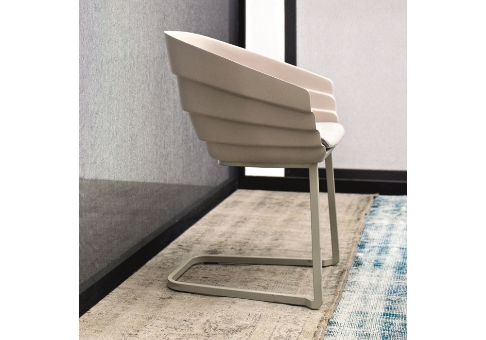 Rift firmata da Patricia Urquiola per Moroso è una sedia cantilever con scocca in poliuretano integrale strutturale stampato e basamento cantilever in acciaio verniciato. Cuscino seduta in poliuretano espanso in tessuto Remix in differenti finiture.