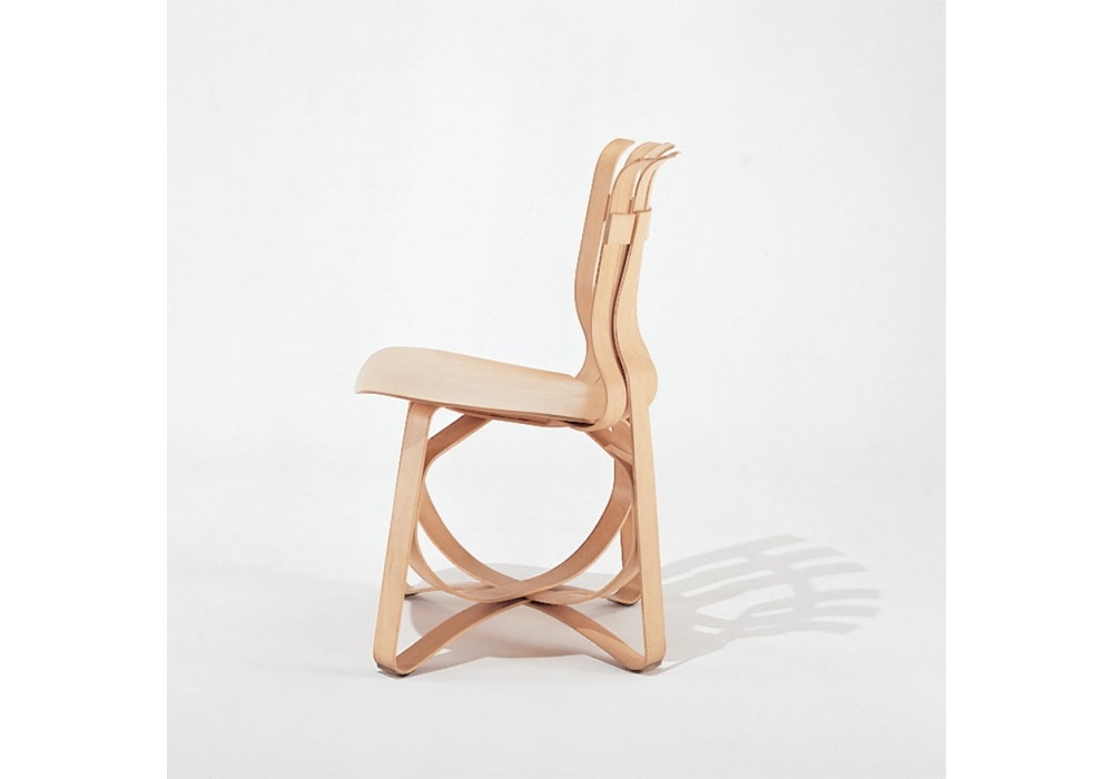 Hat Trick firmata da Frank Gehry per Knoll è una sedia realizzata in legno di acero naturale con piedini in plastica trasparente con finitura opaca. Lo schienale è costituito da fasce preformate per rinforzare il supporto lombare.
